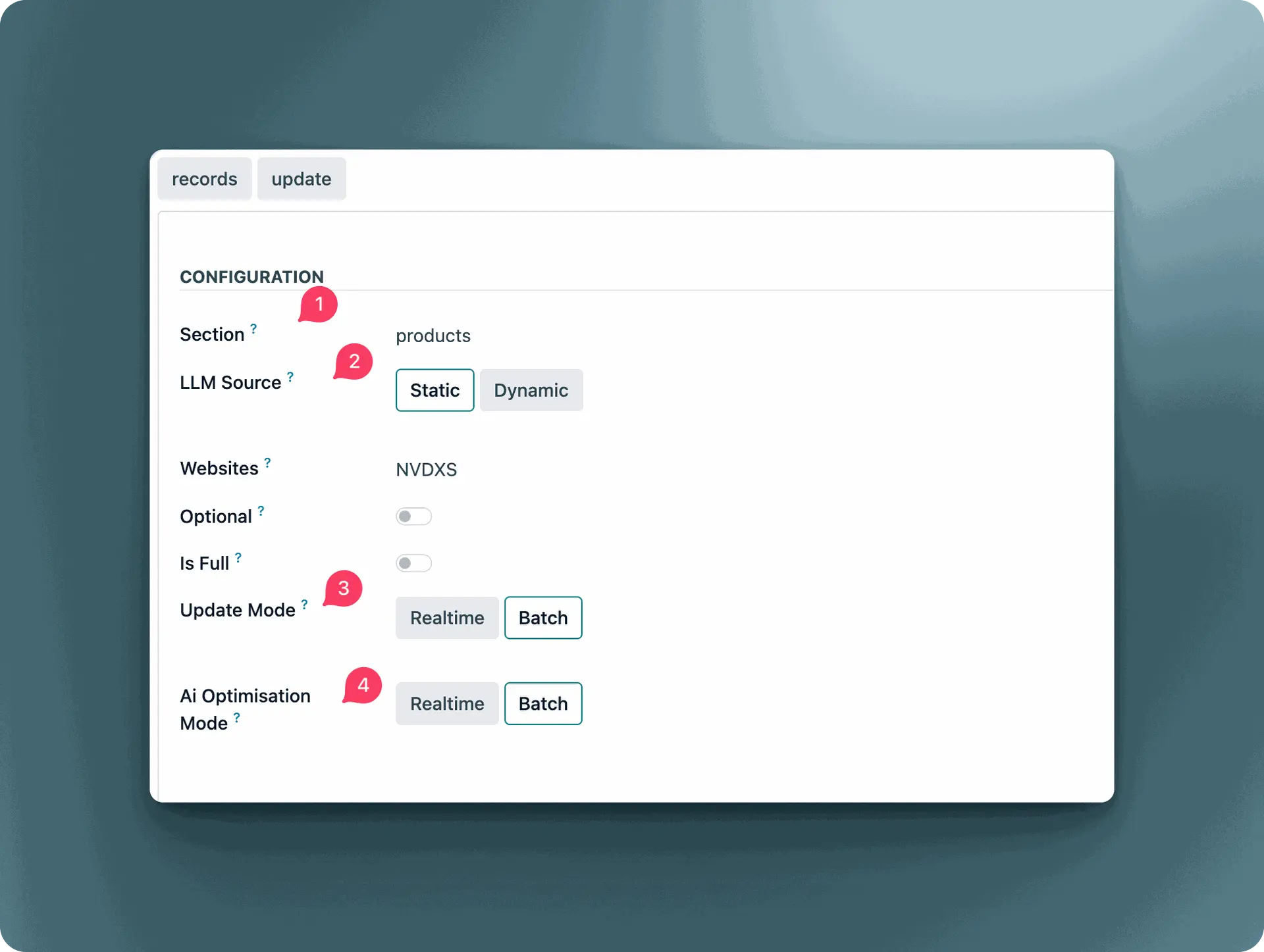 Each LLM configuration belongs to a Section (for example: “Products”, “Blog”, “Services”).
