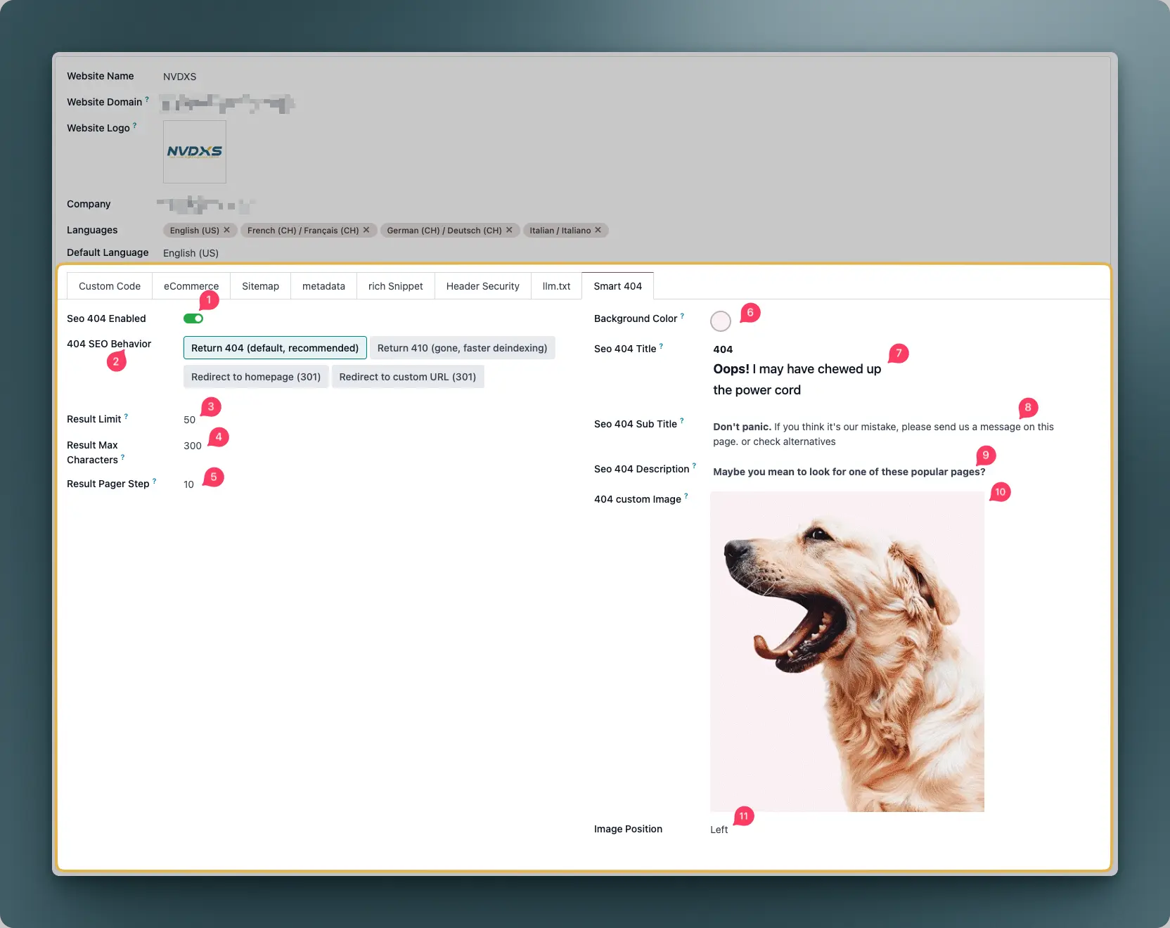 • SEO-Friendly Error Handling: Choose how missing pages behave for SEO: return 404, return 410, redirect to homepage, or redirect to a custom URL.